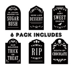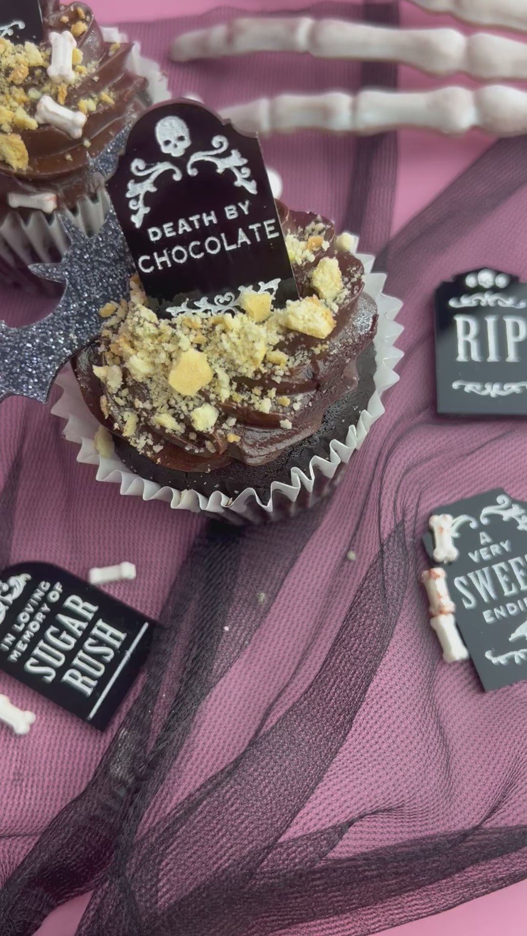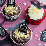 Celebrate with a choice of 6 or 12 pack cheeky Tombstone cupcake toppers. These mini toppers are perfect to be placed on the top of buttercream or ganache decorated cupcakes.