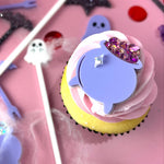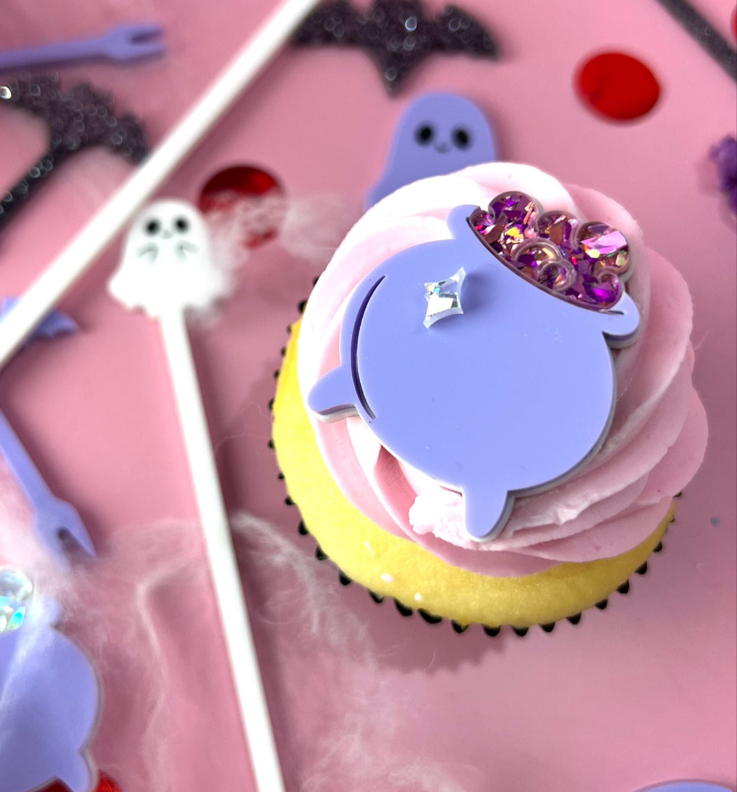 These witch potion pots are to be placed on top of buttercream cupcakes, there is no spike. They come in two colours; Black mirror or Pastel Purple